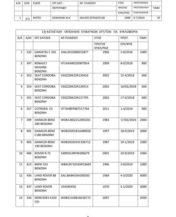 Τα παρακάτω οχήματα ( ως συνημμένες καταστάσεις ) προέρχονται από τα αζήτητα του Τελωνείου, κατασχεμένα και τα κρατικά αποσυρόμενα από την κυκλοφορία κ.λ.π., με τιμή εκκίνησης αυτή που αναφέρεται στην διακήρυξη. O τόπος φύλαξης των δημοπρατούμενων οχημάτων είναι το Τελωνείο Καλαμάτας.