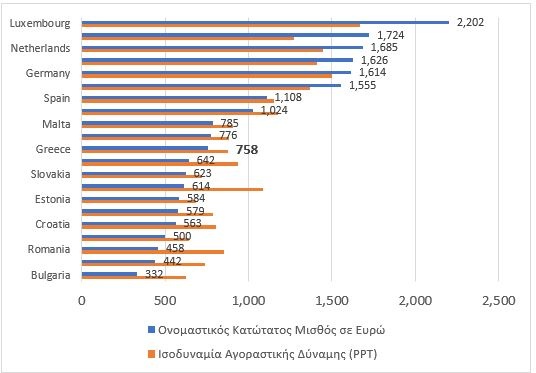 Μεταξύ των 21 κρατών μελών της ΕΕ που έχουν νομοθετημένο κατώτατο μισθό, η Ελλάδα βρίσκεται στη μέση της κατάταξης όσον αφορά το ύψος του κατώτατου μισθού (11η με βάση τον ονομαστικό και 13η με βάση τα Ισοδύναμα Αγοραστικής Δύναμης).