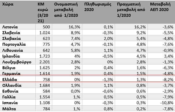 Μεταβολή κατώτατου μισθού στις χώρες της ευρωζώνης (Ιαν. 2020- Μαρ. 2021)