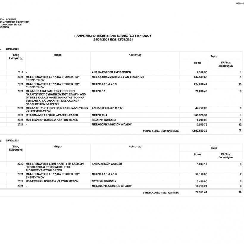 Συγκεκριμένα, ο οργανισμός το διάστημα από τις 26/07/2021 έως τις 02/08/2021 κατέβαλε σε 270 δικαιούχους το ποσό των 7.652.756,72 ευρώ.