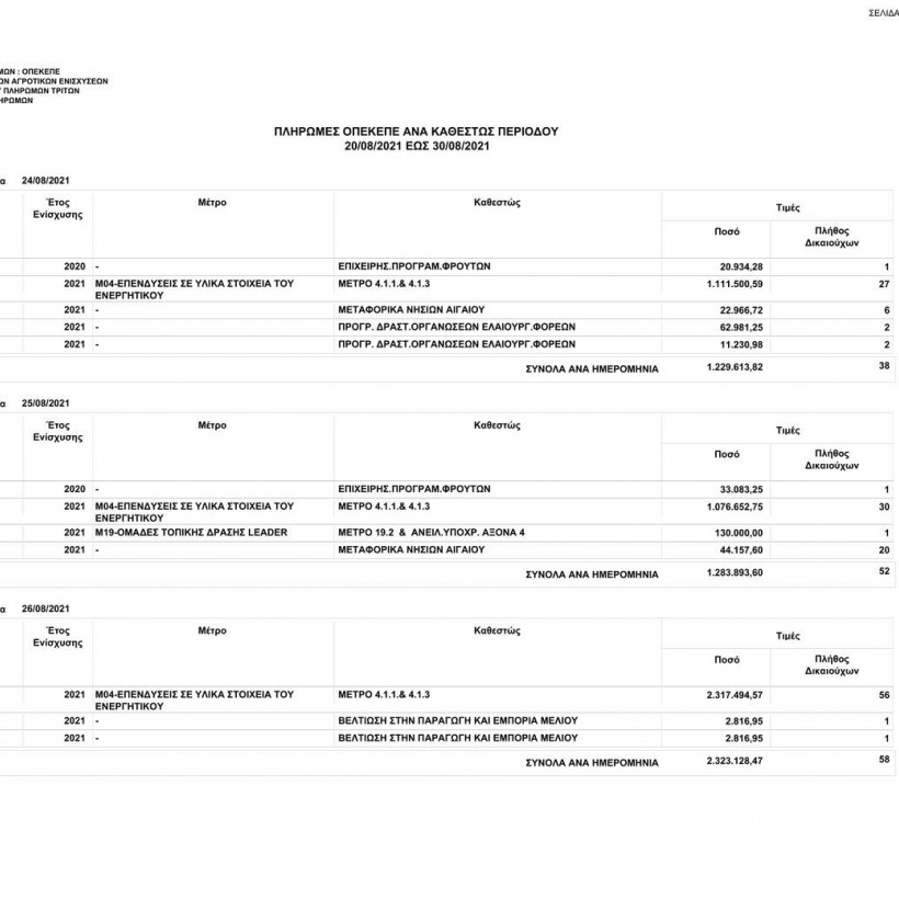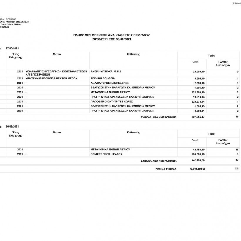 Συγκεκριμένα, ο οργανισμός το διάστημα από τις 20/08/2021 έως τις 30/08/2021 κατέβαλε σε 221 δικαιούχους το ποσό των 6.919.369,09 ευρώ.