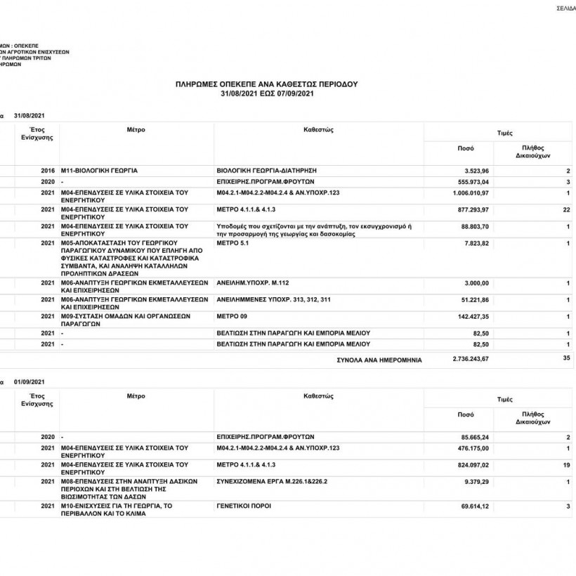 Συγκεκριμένα, ο οργανισμός το διάστημα από τις 31/08/2021 έως τις 07/09/2021 κατέβαλε σε 259 δικαιούχους το ποσό των 10.920.647,82 ευρώ.