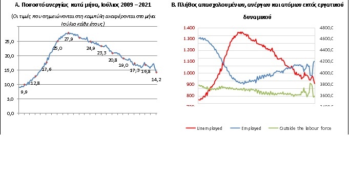 Σύμφωνα με την ΕΛΣΤΑΤ, το εποχικά διορθωμένο ποσοστό ανεργίας τον Ιούλιο του 2021 ανήλθε σε 14,2% έναντι του διορθωμένου προς τα άνω 16,8% τον Ιούλιο του 2020 και του 15,0% τον Ιούνιο του 2021. Οι απασχολούμενοι ανήλθαν σε 4.011.357 άτομα σημειώνοντας αύξηση κατά 182.886 άτομα σε σχέση με τον Ιούλιο του 2020 (+4,8%) και κατά 8.221 άτομα σε σχέση με τον Ιούνιο του 2021 (+0,2%). Οι άνεργοι ανήλθαν σε 664.384 άτομα σημειώνοντας μείωση κατά 108.058 άτομα σε σχέση με τον Ιούλιο του 2020 (-14,0%) και κατά 40.485 άτομα σε σχέση με τον Ιούνιο του 2021 (-5,7%).