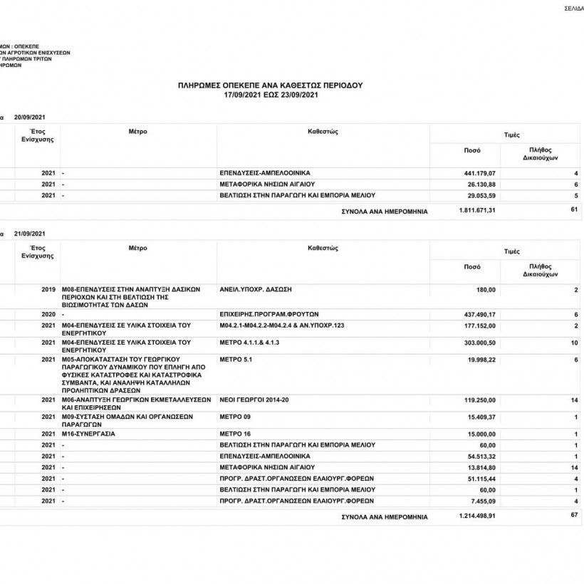 Συγκεκριμένα, ο οργανισμός το διάστημα από τις 17/09/2021 έως τις 23/09/2021 κατέβαλε σε 2.385 δικαιούχους το ποσό των 8.760.503,55 ευρώ.