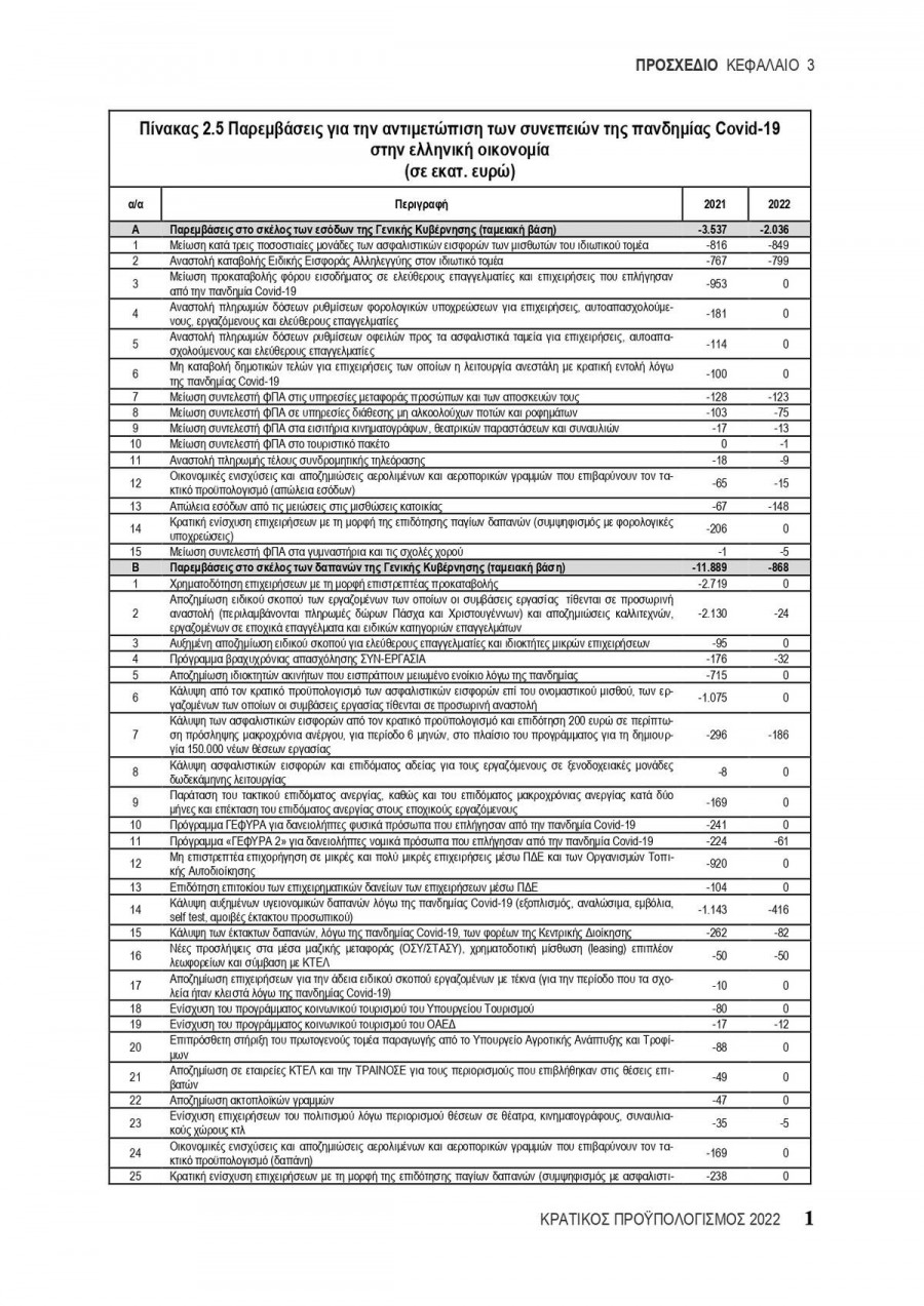 Το δημοσιονομικό κόστος ύψους 18,5 δισ. ευρώ της περιόδου 2021-2022 αναλύεται σε: