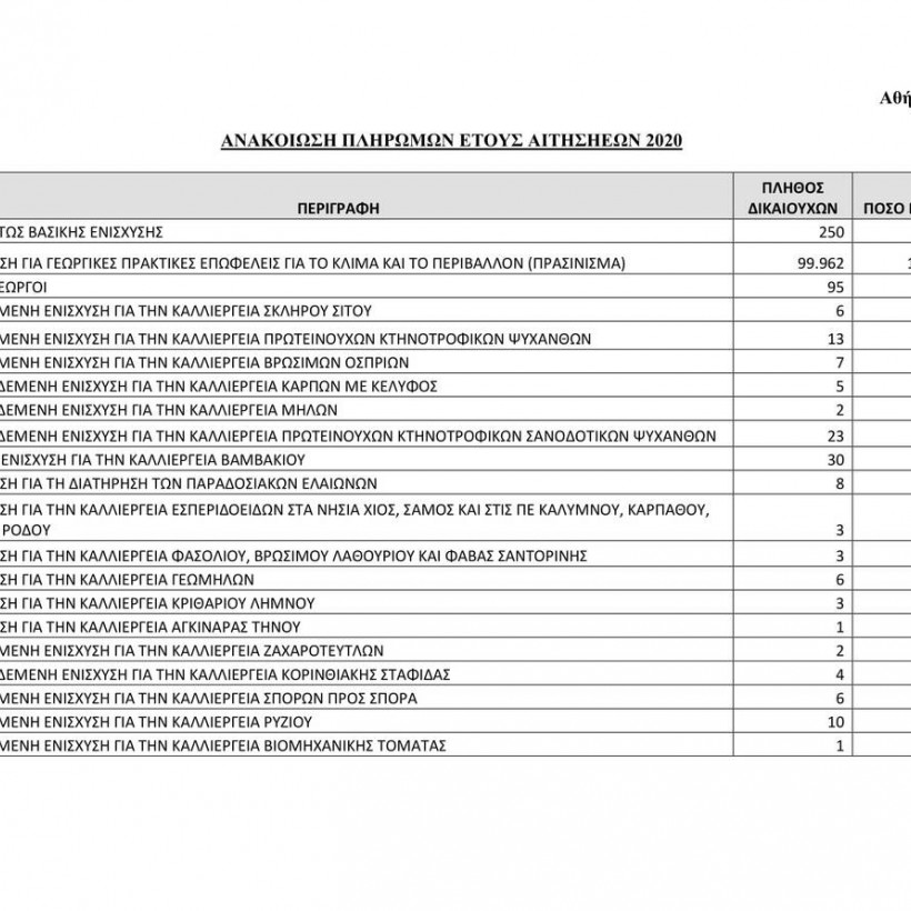 Όπως αναφέρεται σε ανακοίνωση του υπουργείου Αγροτικής Ανάπτυξης και Τροφίμων, ο ΟΠΕΚΕΠΕ «ολοκλήρωσε τον υπολογισμό πληρωμής συνολικού ποσού 3.519.447,79 ευρώ για τα καθεστώτα των άμεσων ενισχύσεων και των ενισχύσεων στα μικρά νησιά Αιγαίου Πελάγους (ΜΝΑ) για τις αιτήσεις του 2020».