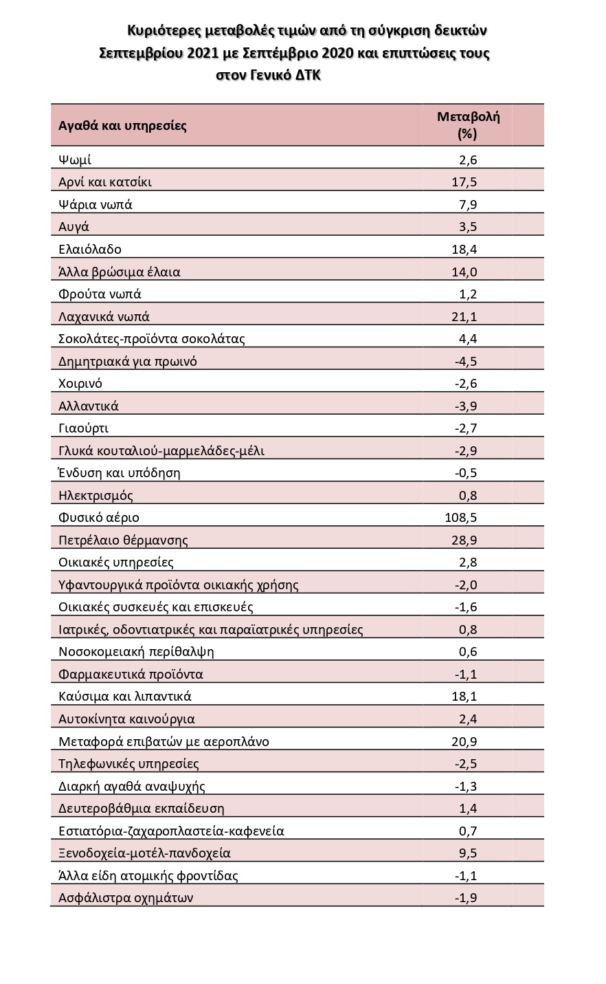 Η αύξηση του Γενικού Δείκτη Τιμών Καταναλωτή κατά 2,2% τον μήνα Σεπτέμβριο 2021, σε σύγκριση με τον αντίστοιχο Δείκτη του Σεπτεμβρίου 2020, προήλθε κυρίως από τις αυξήσεις στις ακόλουθες ομάδες αγαθών και υπηρεσιών:
