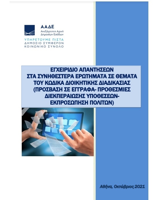 Εγχειρίδιο με τα συνηθέστερα ερωτήματα σε θέματα του Κώδικα Διοικητικής Διαδικασίας εξέδωσε η Ανεξάρτητη Αρχή Δημοσίων Εσόδων (ΑΑΔΕ).