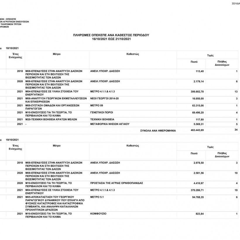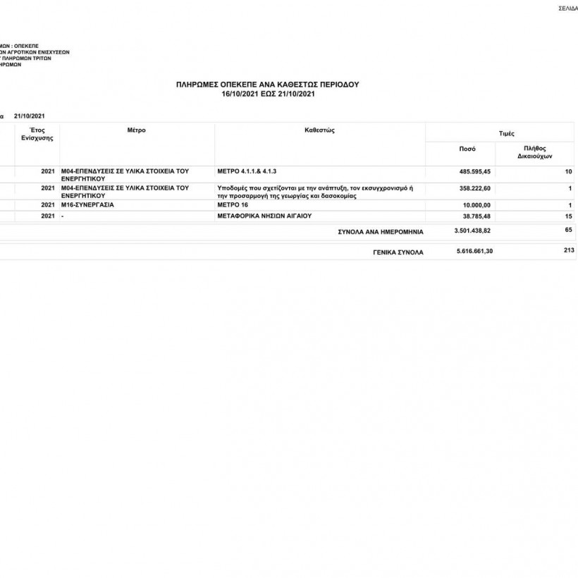 Συγκεκριμένα, ο οργανισμός το διάστημα από τις 16/10/2021 έως τις 21/10/2021 κατέβαλε σε 213 δικαιούχους το ποσό των 5.616.661,30 ευρώ.