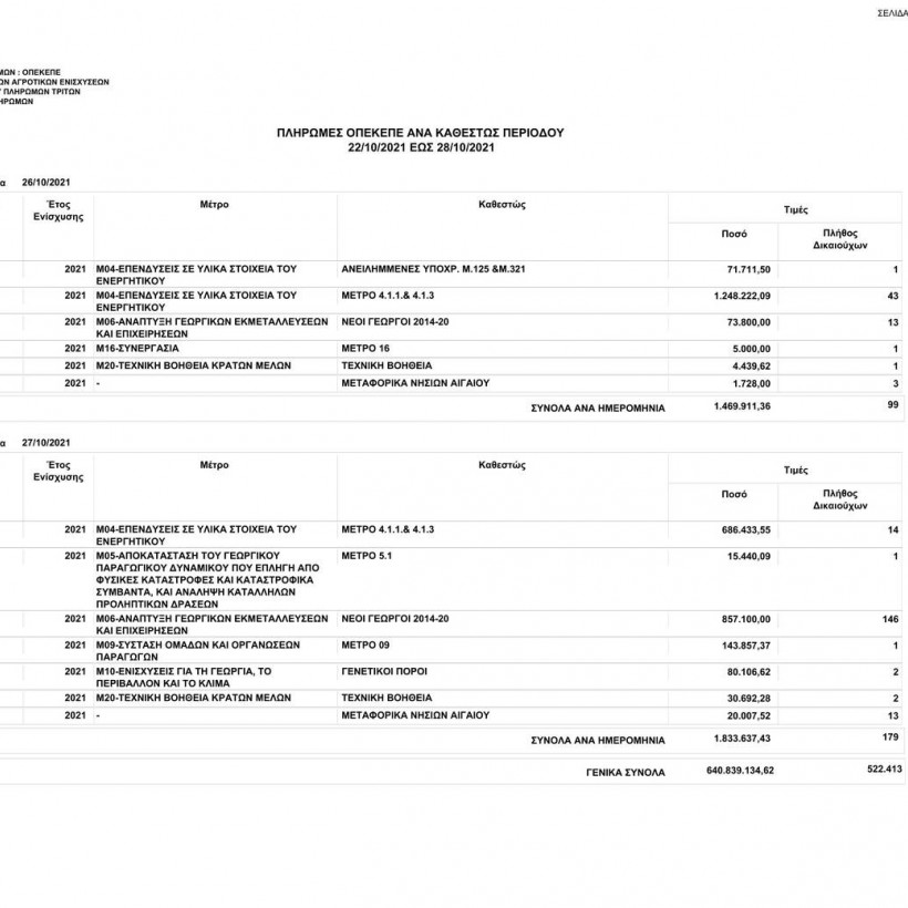 Συγκεκριμένα, ο οργανισμός το διάστημα από τις 22/10/2021 έως 28/10/2021 κατέβαλε σε 522.413 δικαιούχους το ποσό των 640.839.134,62 ευρώ.