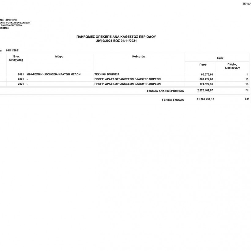 Συγκεκριμένα, ο οργανισμός το διάστημα από τις 29/10/2021 έως τις 04/11/2021 κατέβαλε σε 631 δικαιούχους το ποσό των 11.361.437,15 ευρώ.
