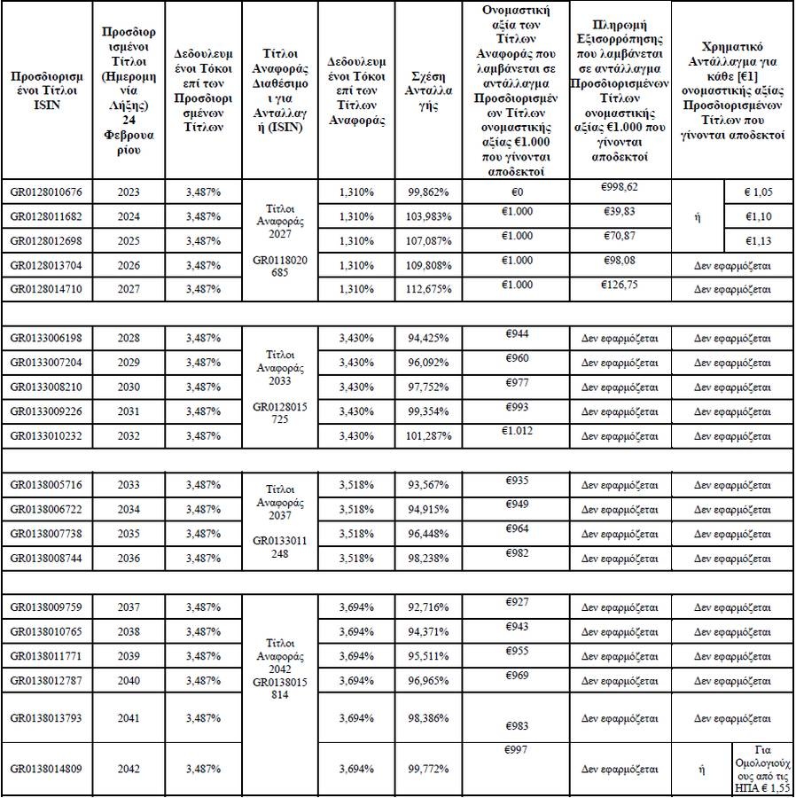 Τα ομόλογα που θα αποκτηθούν στο πλαίσιο της προσφοράς θα αποπληρωθούν με ομολογίες λήξης 22 Απριλίου 2027, με ομολογίες λήξης 30 Ιανουαρίου 2033, με ομολογίες λήξης 30 Ιανουαρίου 2037 και με ομολογίες λήξης 30 Ιανουαρίου 2042.