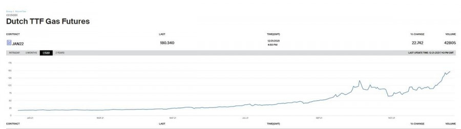 Από την αρχή του 2021 η τιμή του φυσικού αερίου έχει αυξηθεί κατά 820% περίπου, ενώ δεν φαίνεται καμία ένδειξη αποκλιμάκωσης στον ορίζοντα με το συμβόλαιο για τον Φεβρουάριο να είναι και αυτό τα 180 ευρώ ανά μεγαβατώρα.