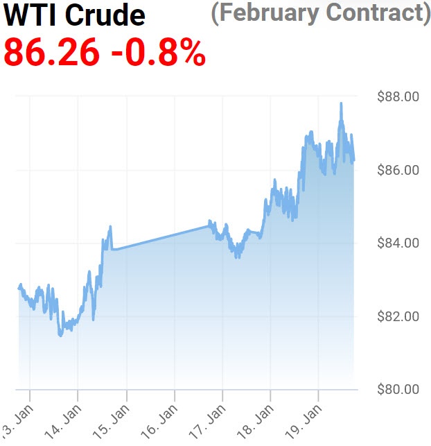- Η τιμή το συμβoλαίου του αμερικάνικου αργού τύπου West Texas Intermediate (WTI) παράδοσης Φεβρουαρίου χάνει -0,8%, στα 86,26 δολάρια το βαρέλι.