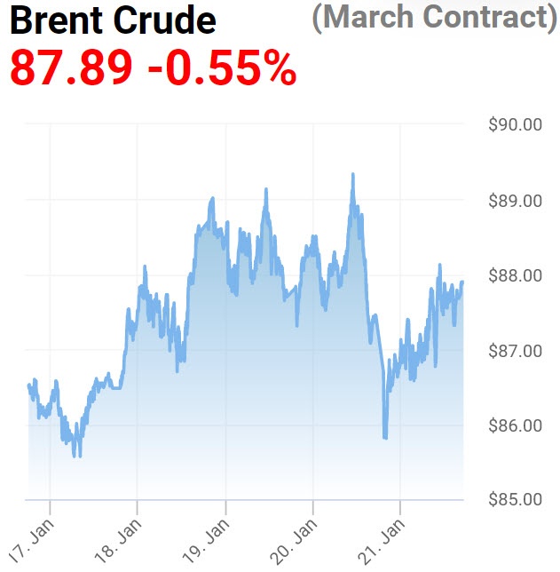- Το πετρέλαιο τύπου Βrent παράδοσης Μαρτίου, που αποτελεί και παγκόσμιο σημείο αναφοράς, ξεκίνησε τη συνεδρίαση με πτώση κατά -0,55% στα 87,87δολάρια το βαρέλι.