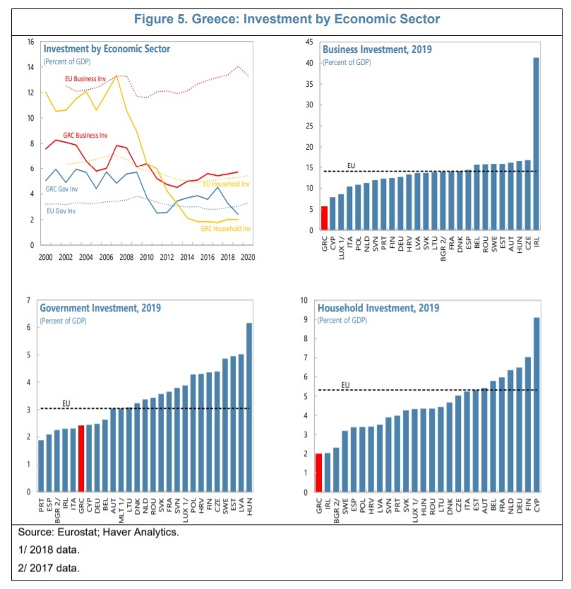 Κατά το ΔΝΤ στο τέλος του 2019 το ποσοστό των επενδύσεων στην Ελλάδα ήταν ένα από τα χαμηλότερα στον κόσμο, όταν πριν από το 2008, το επενδυτικό ποσοστό της Ελλάδας ήταν σε γενικές γραμμές ευθυγραμμισμένο με το αντίστοιχο ποσοστό της Κύπρου, της Πορτογαλίας και της Ισπανίας και κοντά ή πάνω από τον μέσο όρο της ΕΕ.