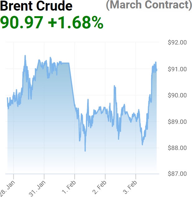 - Το πετρέλαιο τύπου Βrent παράδοσης Μαρτίου, που αποτελεί και παγκόσμιο σημείο αναφοράς, θα ξεκινήσει τη συνεδρίαση με άνοδο στο 1,68% στα 90,97 δολάρια το βαρέλι.