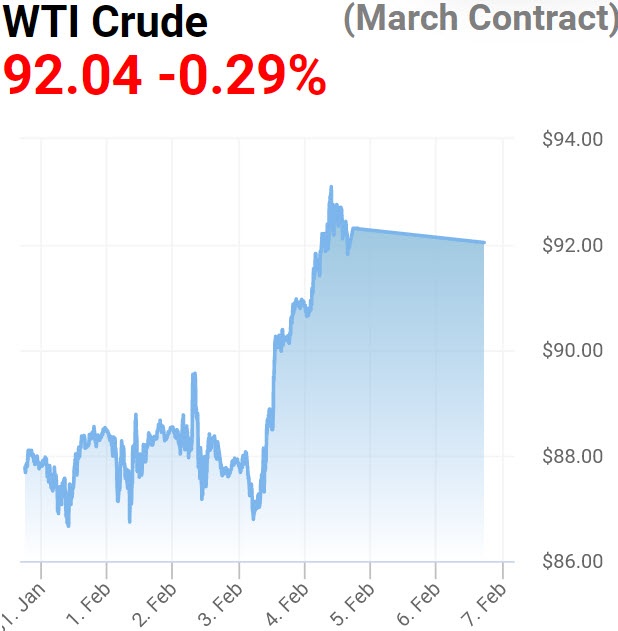 - Η τιμή το συμβολαίου του αμερικάνικου αργού τύπου West Texas Intermediate (WTI) παράδοσης Μαρτίου χάνει -0,29% στα 92,04 δολάρια το βαρέλι.