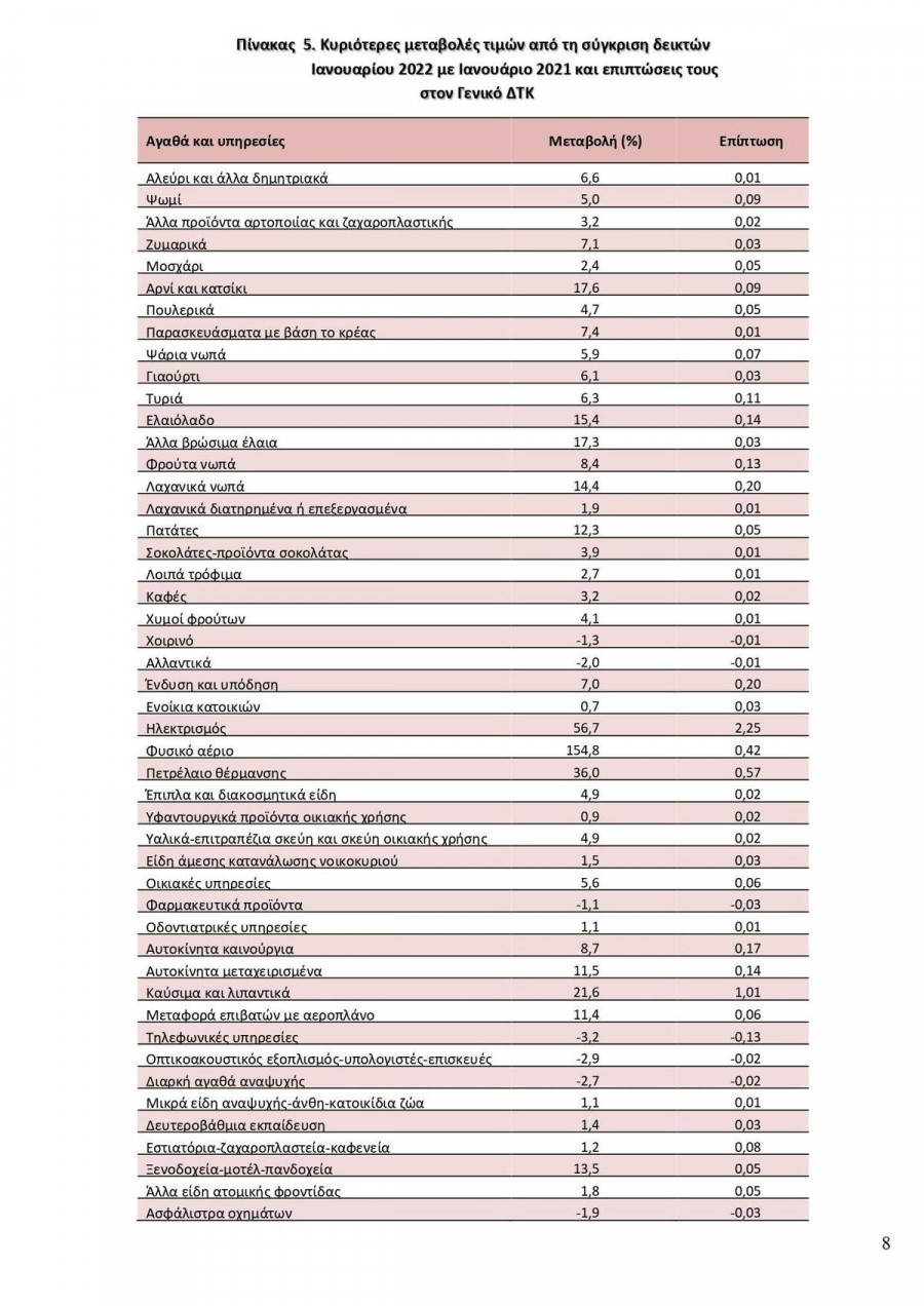 Οι σημαντικότερες μεταβολές τιμών ανά προϊόν και υπηρεσία τον Ιανουάριο 2022 είχαν ως εξής: