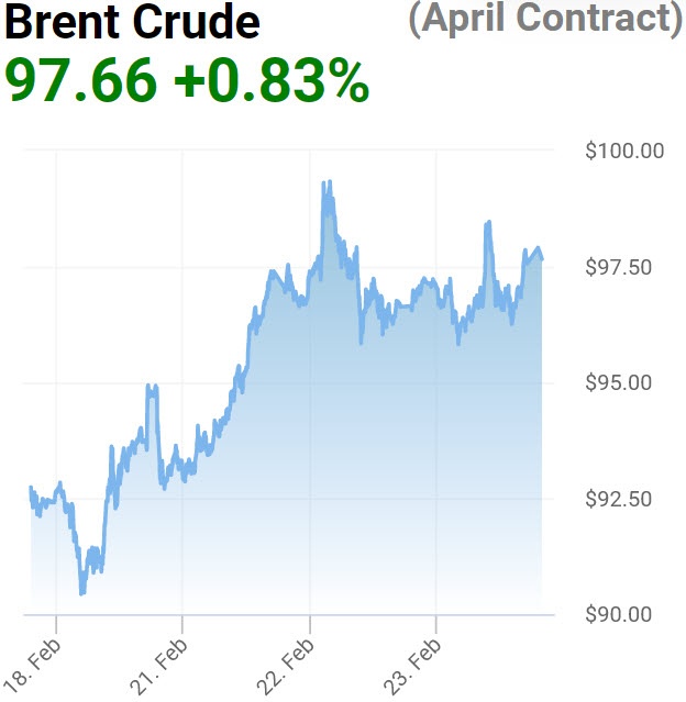- Το πετρέλαιο τύπου Βrent παράδοσης Απριλίου, που αποτελεί και παγκόσμιο σημείο αναφοράς, ξεκίνησε τη συνεδρίαση με άνοδο στο 0,83% στα 97,66 δολάρια το βαρέλι.