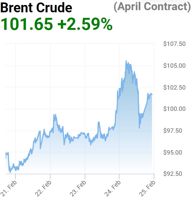 Ουκρανία - Όλες οι ειδήσεις: Η τιμή του πετρελαίου ξεπέρασε την Παρασκευή (25/2) τα 101 δολάρια το βαρέλι στις ασιατικές αγορές.
