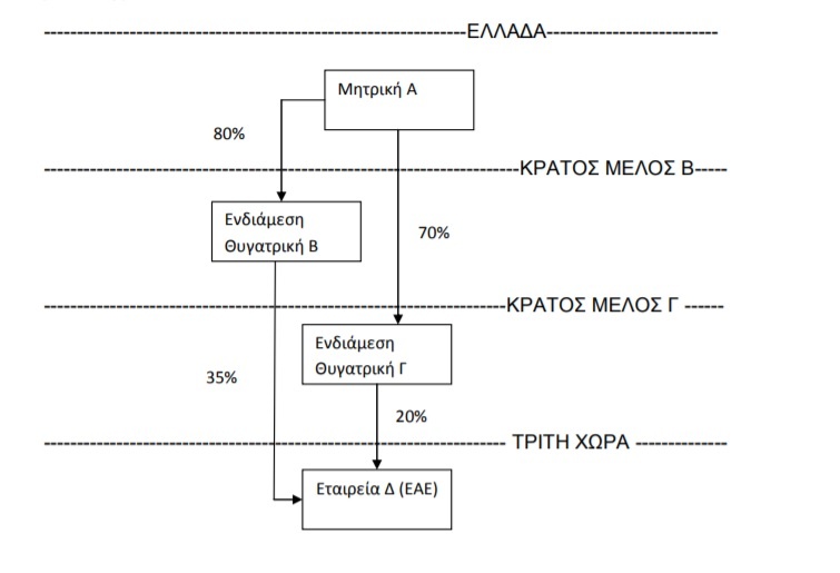 27. Ομοίως, αν στο ανωτέρω παράδειγμα μεσολαβούσε αλυσίδα συνδεδεμένων αλλοδαπών εταιρειών το εισόδημα της ΕΑΕ θα λαμβάνονταν υπόψη επίσης από την πρώτη Ελληνική εταιρεία που μεσολαβεί στο σχήμα αυτό, δηλαδή την Β.