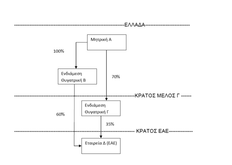 26. Ωστόσο, στην περίπτωση που μία εκ των ενδιάμεσων εταιρειών είναι επίσης φορολογικός κάτοικος Ελλάδος, θα λαμβάνεται υπόψη το εισόδημα της ΕΑΕ μόνο από την εταιρεία η οποία διατηρεί άμεση και ευθεία συμμετοχή στην ΕΑΕ (πρώτη στην αλυσίδα εταιρεία που συναντάται στην Ελλάδα) και η οποία θα αποκτούσε εισόδημα από εισπραττόμενα μερίσματα, αν η ΕΑΕ προχωρούσε σε διανομή. Δηλαδή στο παρακάτω παράδειγμα 3 από την ενδιάμεση θυγατρική Β.