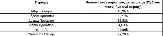 Η διαθεσιμότητα ακινήτων με μηνιαίο ζητούμενο μίσθωμα έως 600€, επικεντρώνεται κυρίως σε μη ανακαινισμένα διαμερίσματα κατασκευής 1970-1980, αν πρόκειται για τις καλές περιοχές του κέντρου, ενώ μερικώς ή/και ολικώς ανακαινισμένα διατίθενται κυρίως σε περιοχές όπως ο Νέος Κόσμος, Κυψέλη, Γκάζι και Βοτανικός. Νεότερα ηλικιακά ακίνητα κατασκευής μετά το 2000 διατίθενται κυρίως σε περιοχές όπως