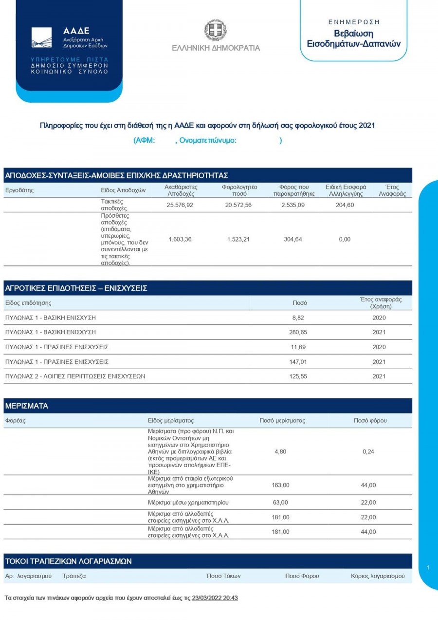 - Για πρώτη φορά, οι πολίτες μπορούν να βλέπουν σε έναν συγκεντρωτικό πίνακακαι ξεχωριστά για τον κάθε σύζυγο/μέλος συμφώνου συμβίωσης, τα βασικά στοιχεία που έχουν ληφθεί από φορείς, τόσο για εισοδήματα(τρέχουσες και αναδρομικές αποδοχές, αγροτικές επιδοτήσεις – ενισχύσεις, μερίσματα, τόκοι, δικαιώματα κλπ), όσο και για δαπάνες (δίδακτρα, δάνεια, δαπάνες με ηλεκτρονικά μέσα πληρωμής κ.α.).