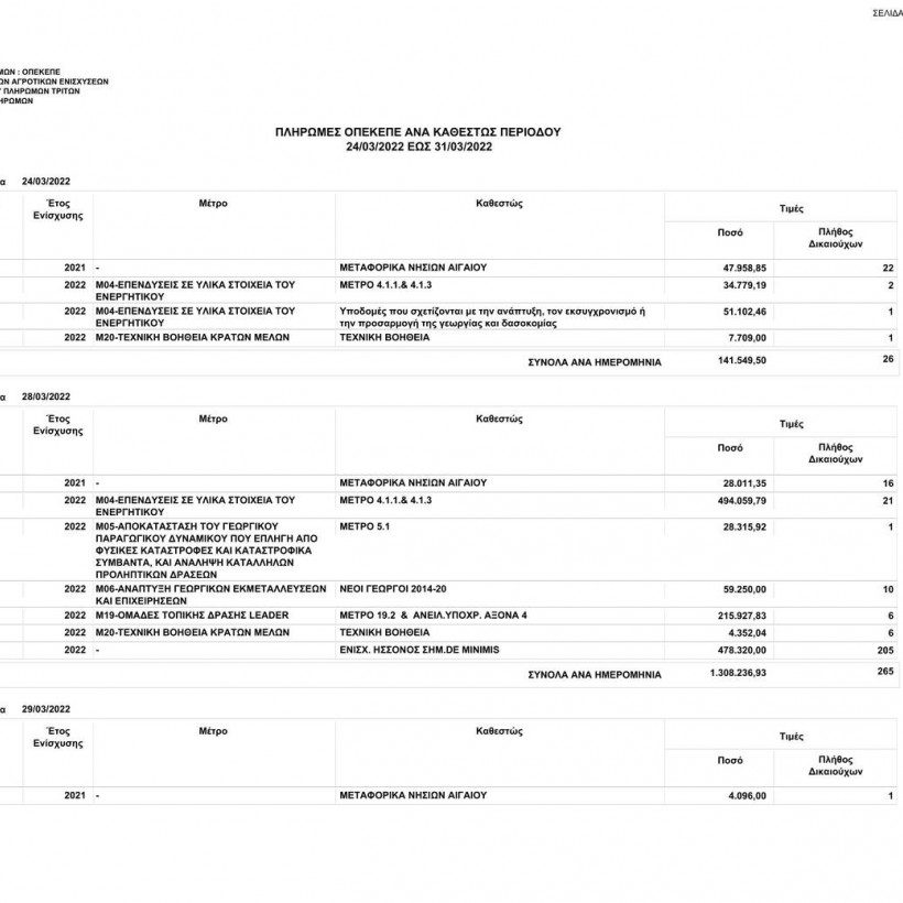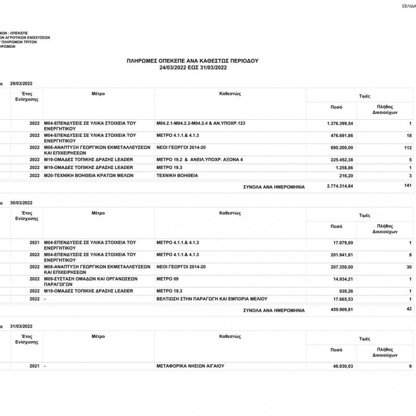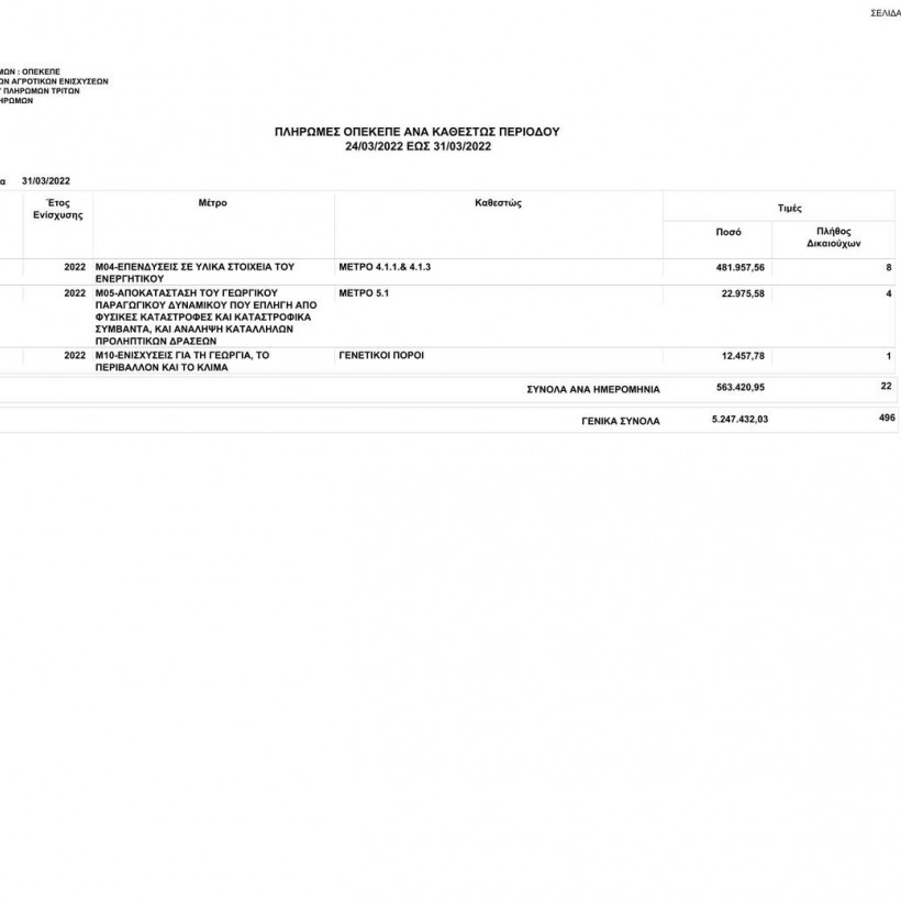 Συγκεκριμένα, ο οργανισμός το διάστημα από τις 24/03/2022 έως τις 31/03/2022 κατέβαλε σε 496 δικαιούχους το ποσό των 5.247.432,03 ευρώ.