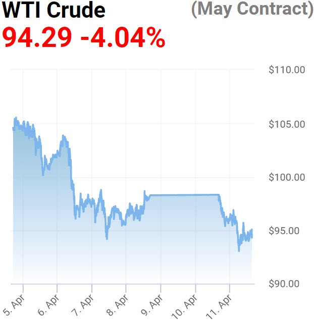 - Η τιμή το συμβολαίου του αμερικάνικου αργού τύπου West Texas Intermediate (WTI) παράδοσης Απριλίου χάνει -4,04% στα 94,29 δολάρια το βαρέλι.