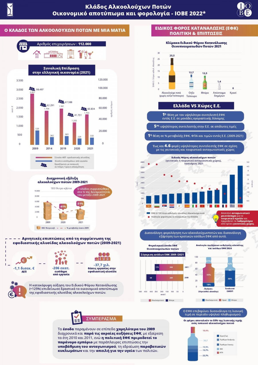 Σύμφωνα με τη μελέτη του ΙΟΒΕ, η Ελλάδα έχει τον υψηλότερο συντελεστή ΕΦΚ αλκοολούχων ποτών ανάμεσα στις χώρες της ΕΕ-27 (σε μονάδες αγοραστικής δύναμης) και υπερδιπλάσιο από τον μέσο όρο γειτονικών και τουριστικά ανταγωνιστικών χωρών.