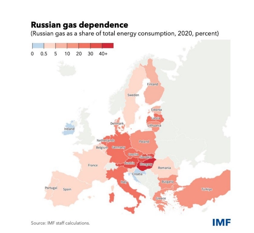 Κατά το ΔΝΤ, η εξάρτηση από τη Ρωσία για φυσικό αέριο και άλλες πηγές ενέργειας ποικίλλει σε μεγάλο βαθμό ανά χώρα. «Μια μείωση έως και 70% του ρωσικού φυσικού αερίου θα μπορούσε να αντιμετωπιστεί βραχυπρόθεσμα με την πρόσβαση σε εναλλακτικές προμήθειες και πηγές ενέργειας», αναφέρει το Ταμείο και προσθέτει πως αυτό εξηγεί γιατί ορισμένες χώρες μπόρεσαν να σταματήσουν μονομερώς τις εισαγωγές αερίου από τη Ρωσία.
