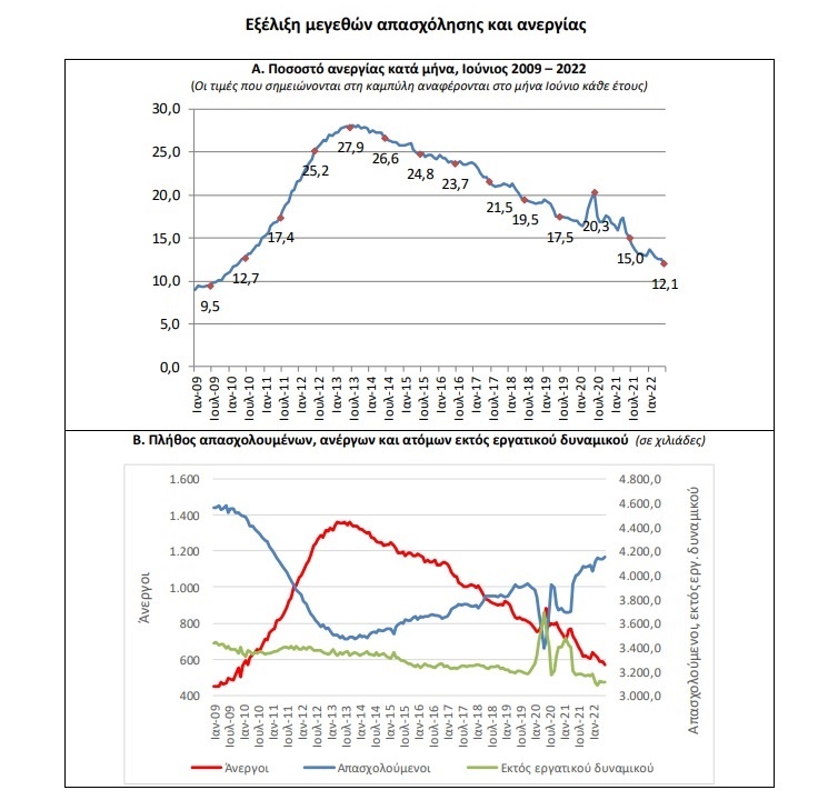 - Το εποχικά διορθωμένο ποσοστό ανεργίας τον Ιούνιο του 2022 ανήλθε σε 12,1% έναντι 15,0% τον Ιούνιο του 2021 και 12,5% τον Μάιο του 2022.