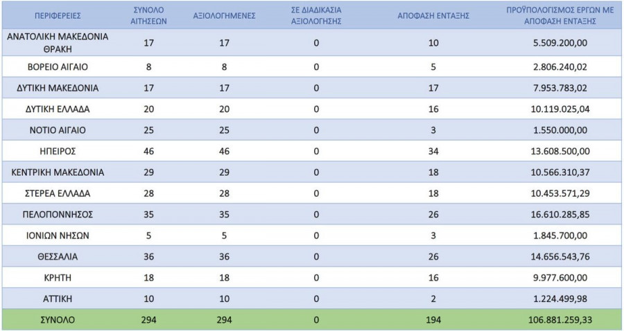 Σύμφωνα με τον προσωρινό πίνακα αποτελεσμάτων που δημοσίευσε το ΥΠΑΑΤ, από τις 13 Περιφέρειες της χώρας υπεβλήθησαν συνολικά 294 αιτήσεις, εκ των οποίων έγιναν δεκτές οι 194, συνολικής επιλέξιμης δαπάνης 106.881.259,33 ευρώ, με την υπερδέσμευση ύψους 63 εκατ. ευρώ που έχει ήδη εγκριθεί.
