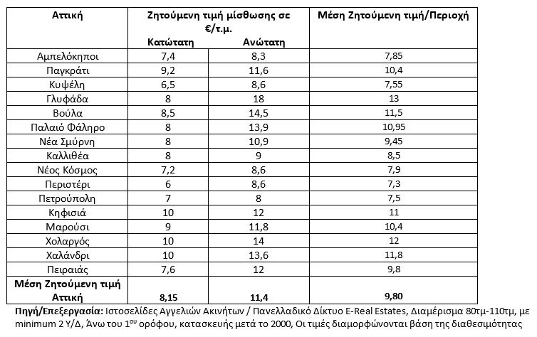 Χαρακτηριστικό παράδειγμα αποτελούν τα Βόρεια Προάστια όπου το 93,11% των διαθέσιμων προς μίσθωση ακινήτων, το ζητούμενο μίσθωμα είναι άνω των 800€/μήνα. Στα Νότια προάστια αγγίζει το 81,44% και στο κέντρο της Αθήνας το 65,66% αφορά ακίνητα με ζητούμενο μίσθωμα άνω των 700€/μήνα.