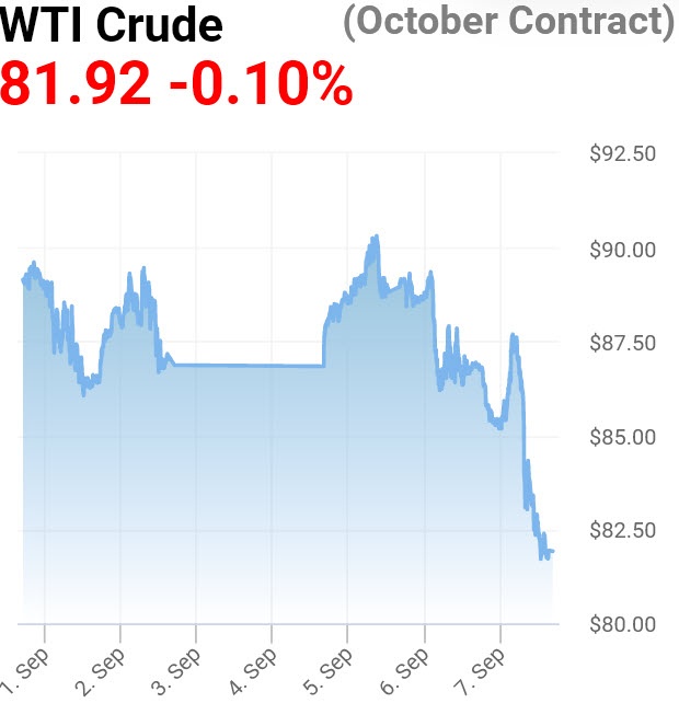 Νέα πτώση σημείωσαν στη Νέα Υόρκη την Τετάρτη (8/9) οι διεθνείς τιμές του πετρελαίου, με τον WTI να κλείνει λίγο κάτω τα 82 δολάρια το βαρέλι.