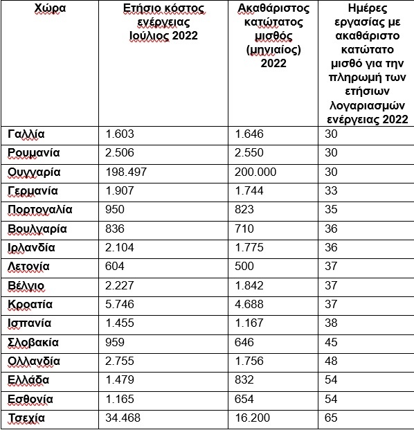 Ο αριθμός των ημερών που ένα άτομο που κερδίζει τον κατώτατο μισθό πρέπει να εργαστεί για να πληρώσει τον λογαριασμό ενέργειας έχει αυξηθεί δραματικά σε ορισμένες χώρες: Εσθονία (+26), Κάτω Χώρες (+20), Τσεχία (+17), Λετονία (+16).