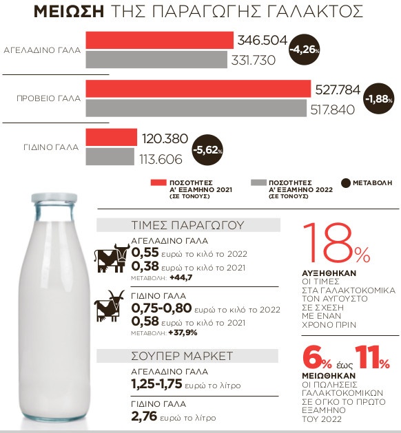Ενδεικτικά, σύμφωνα με τον «Ελεύθερο Τύπο» αυτήν την περίοδο το αγελαδινό γάλα πωλείται από τον παραγωγό κατά 44,7% ακριβότερο σε σχέση με πέρυσι (από 0,38 ευρώ στα 0,55 ευρώ το κιλό) και φτάνει στον καταναλωτή από 1,25 έως 1,75 ευρώ το λίτρο, δηλαδή με μια αύξηση της τιμής κατά περίπου 19,5% συγκριτικά με την 1η Μαρτίου, λίγες ημέρες μετά τη ρωσική εισβολή στην Ουκρανία. Αντίστοιχα, το κατσικίσιο φεύγει από τον κτηνοτρόφο στα 0,75-0,80 ευρώ το κιλό και η μέση τιμή του στο ράφι, σύμφωνα με το Παρατηρητήριο Τιμών του υπουργείου Ανάπτυξης, αγγίζει τα 2,76 ευρώ το λίτρο.