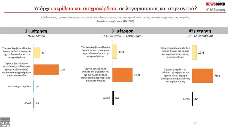 Αξίζει να σημειωθεί πως σύμφωνα με την έρευνα το 79,2% των ερωτηθέντων θεωρεί πως έχουμε ξεπεράσει το επίπεδο της ακρίβειας και έχουμε πλέον σοβαρά φαινόμενα αισχροκέρδειας και κερδοσκοπίας. Προ εξαμήνου το ποσοστό αυτό ήταν στο 75,9%.