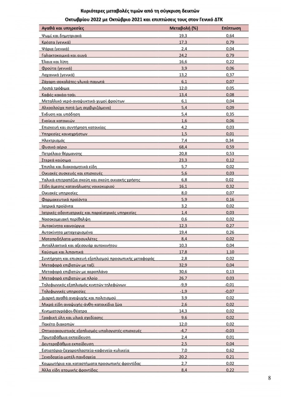 Η αύξηση του πληθωρισμού κατά 9,1% τον μήνα Οκτώβριο 2022, σε σύγκριση με τον αντίστοιχο Δείκτη του Οκτωβρίου 2021, προήλθε κυρίως από τις αυξήσεις των εξής δεικτών:
