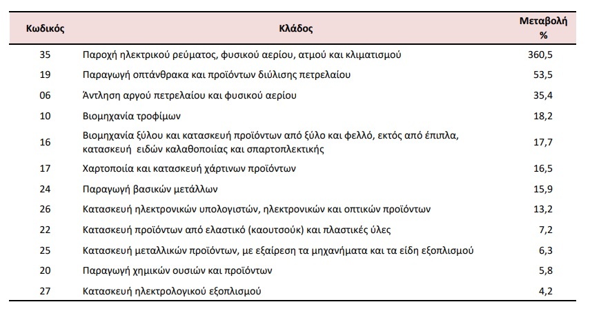 Μακράν τη μεγαλύτερη άνοδο στο δείκτη καταγράφει ο κωδικός «παραγωγή ηλεκτρικού ρεύματος, φυσικού αερίου, ατμού και κλιματισμού» με άνοδο 360,5%.