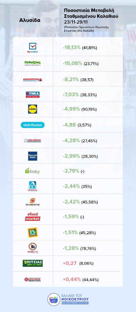 Ως εκ τούτου, το συνολικό κόστος του «καλαθιού του νοικοκυριού» είναι αισθητά μειωμένο στη συντριπτική πλειονότητα των σούπερ μάρκετ με τη μεγαλύτερη μείωση -18,1% στην αλυσίδα My market.