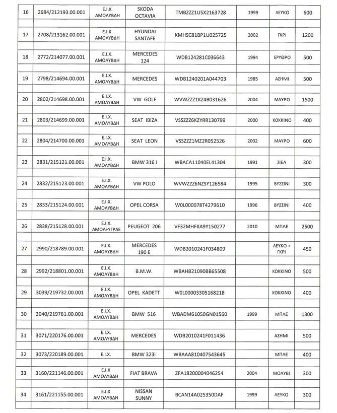 Παρατήρηση 3η: Στις τιμές εκποίησης των οχημάτων συμπεριλαμβάνεται ο αναλογούν ΦΠΑ 24%. Σε περίπτωση εξοφλήσεως του τιμήματος με εφάπαξ καταβολή, ο αγοραστής έχει δικαίωμα έκπτωσης 30% στην τιμή κατακύρωσης.