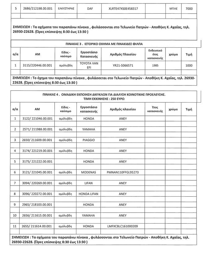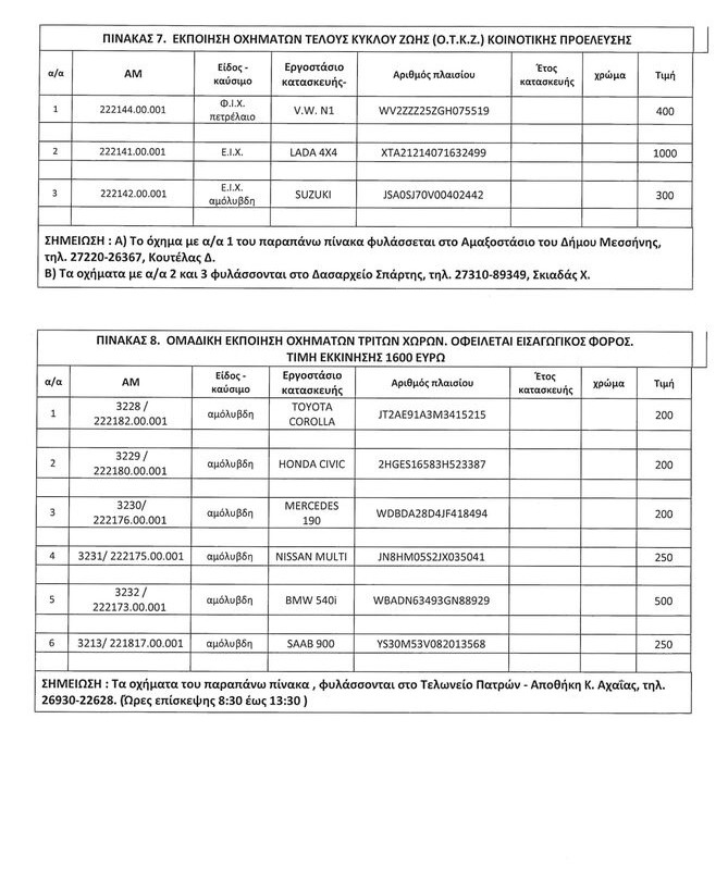 Την Πέμπτη (1/12) στις 10:00 το πρωί, θα διεξαχθεί στην αποθήκη του Τελωνείου Πατρών, προφορική πλειοδοτική Δημοπρασία για να πουληθούν το καθένα χωριστά, τα παρακάτω επιβατικά αυτοκίνητα για κυκλοφορία, Οχήματα Τέλους Κύκλου Ζωής (Ο.Τ.Κ.Ζ.) και ΜΟΤΟ για διάλυση, κοινοτικά και μή, με τιμή εκκίνησης αυτή που αναφέρεται στην gallery που ακολουθεί.
