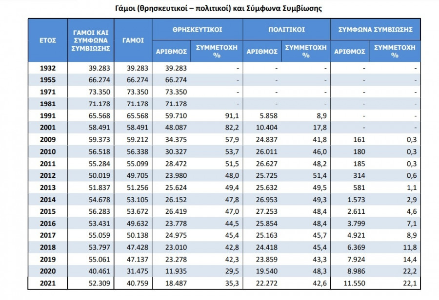 Οι πολιτικοί γάμοι αποτελούσαν έως τις αρχές του 2000 μόλις το 17% των ετησίως τελεσθέντων γάμων. Ωστόσο, αυτό άλλαξε δραστικά μέσα σε δύο δεκαετίες. Η τάση των ζευγαριών να επιλέγουν τον πολιτικό γάμο εντάθηκε στη συνέχεια, με αποτέλεσμα να αποτελούν πλέον το 45-50% του συνόλου την περίοδο 2011-2021. Αν προστεθούν στους πολιτικούς γάμους και τα σύμφωνα συμβίωσης, οι συνολικοί θρησκευτικοί γάμοι έχουν περιορισθεί στο 35% του συνόλου.