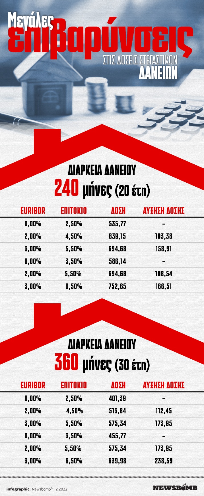 Για ένα δάνειο π.χ. 100.000 ευρώ που δόθηκε το 2014 με επιτόκιο 3,5% και σήμερα έχει αυξηθεί στο 5,5% και έχει διάρκεια αποπληρωμής τα 20 χρόνια, η δόση έχει αυξηθεί σε σχέση με τον Ιούλιο από τα 586,14 ευρώ στα 694,68 ευρώ και θα φθάσει έως και τα 752,65 ευρώ τους προσεχείς μήνες –εφόσον το euribor αυξηθεί στο 3%– ανεβάζοντας το κόστος κατά 108,54 ευρώ έως και 166,5 ευρώ σε περίπτωση περαιτέρω ανόδου των επιτοκίων. Η επιβάρυνση στη μηνιαία δόση από τη μέχρι σήμερα άνοδο του euribor φθάνει στα 174 ευρώ, όταν το ίδιο δάνειο αποπληρώνεται στα 30 χρόνια και προβλέπεται να αυξηθεί έως τα 238,59 ευρώ εντός του 2023 όταν το euribor θα φθάσει το 3%.