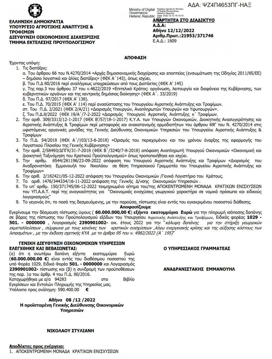 Σύμφωνα με την απόφαση που δημοσιεύθηκε στη Διαύγεια το εν λόγω ποσό αφορά στην «κάλυψη δαπάνης για την στήριξη γεωργικών εκμεταλλεύσεων, σύμφωνα με τους κανόνες των κρατικών ενισχύσεων, λόγω ενεργειακής κρίσης και της αύξησης κόστους των Λιπασμάτων».