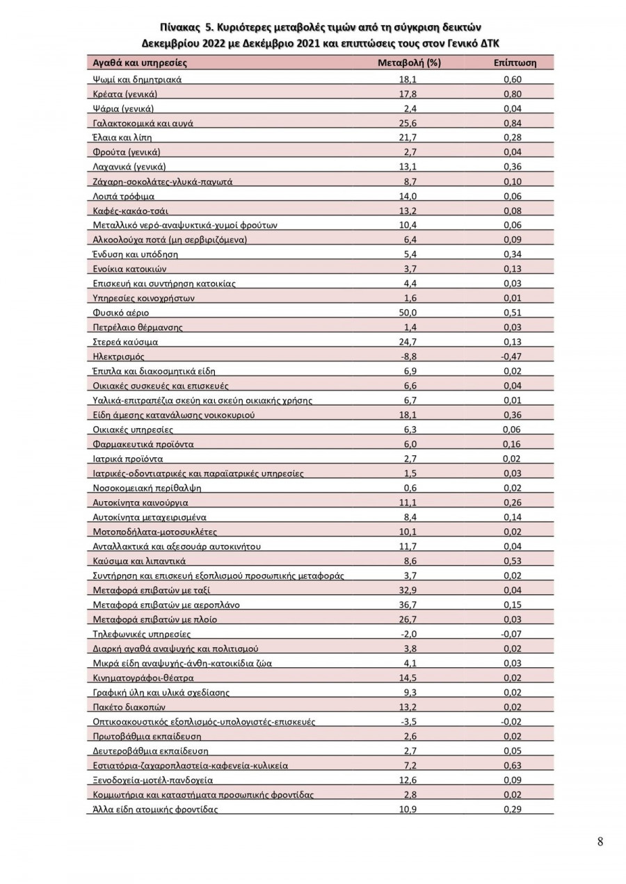 Η αύξηση του Γενικού Δείκτη Τιμών Καταναλωτή κατά 7,2% τον μήνα Δεκέμβριο 2022, σε σύγκριση με τον αντίστοιχο Δείκτη του Δεκεμβρίου 2021, προήλθε κυρίως από τις μεταβολές στις ακόλουθες ομάδες αγαθών και υπηρεσιών: 1. Από τις αυξήσεις των δεικτών κατά: