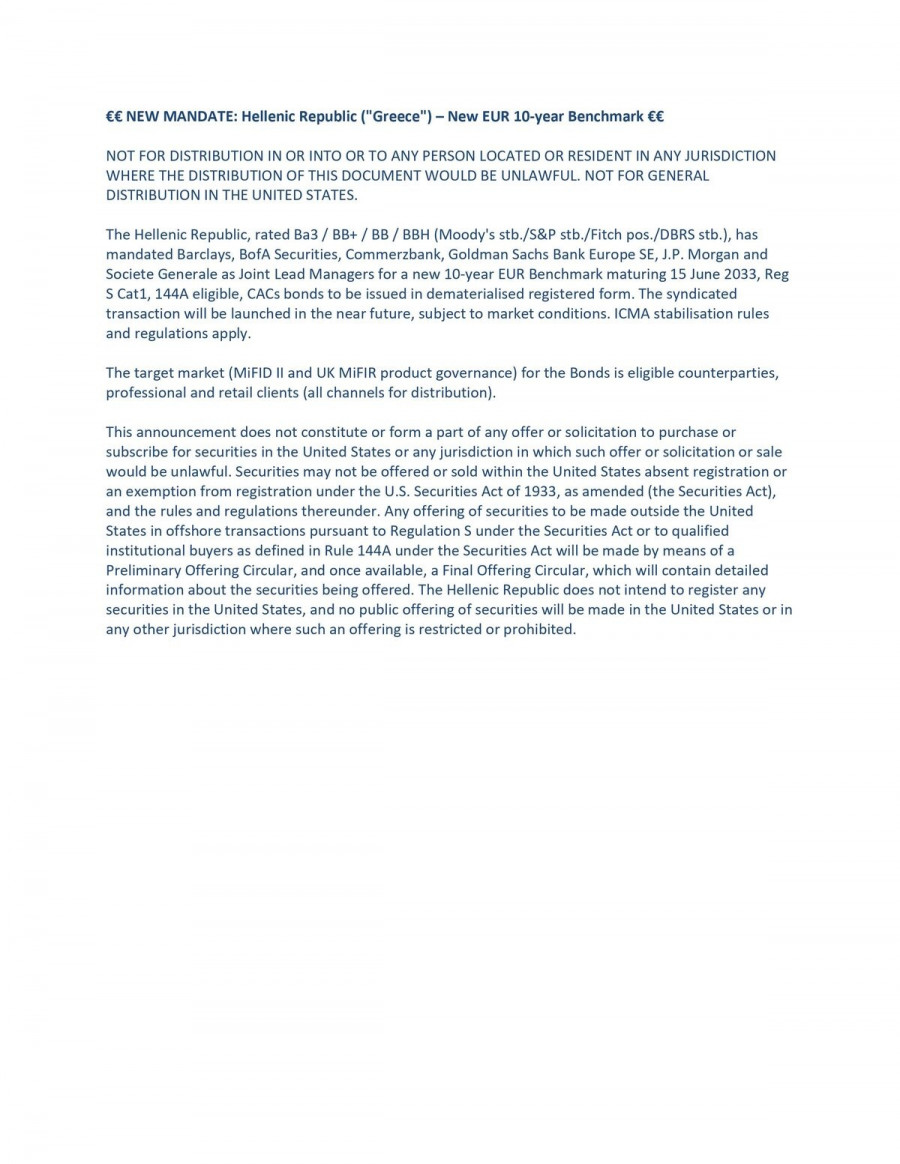 Η εντολή δόθηκε σε Barclays, Bofa Securities, Commerzbank, Goldman Sachs, JP Morgan και Societe Generale για νέο δεκαετές ομόλογο με ωρίμανση στις 15 Ιουνίου του 2033.